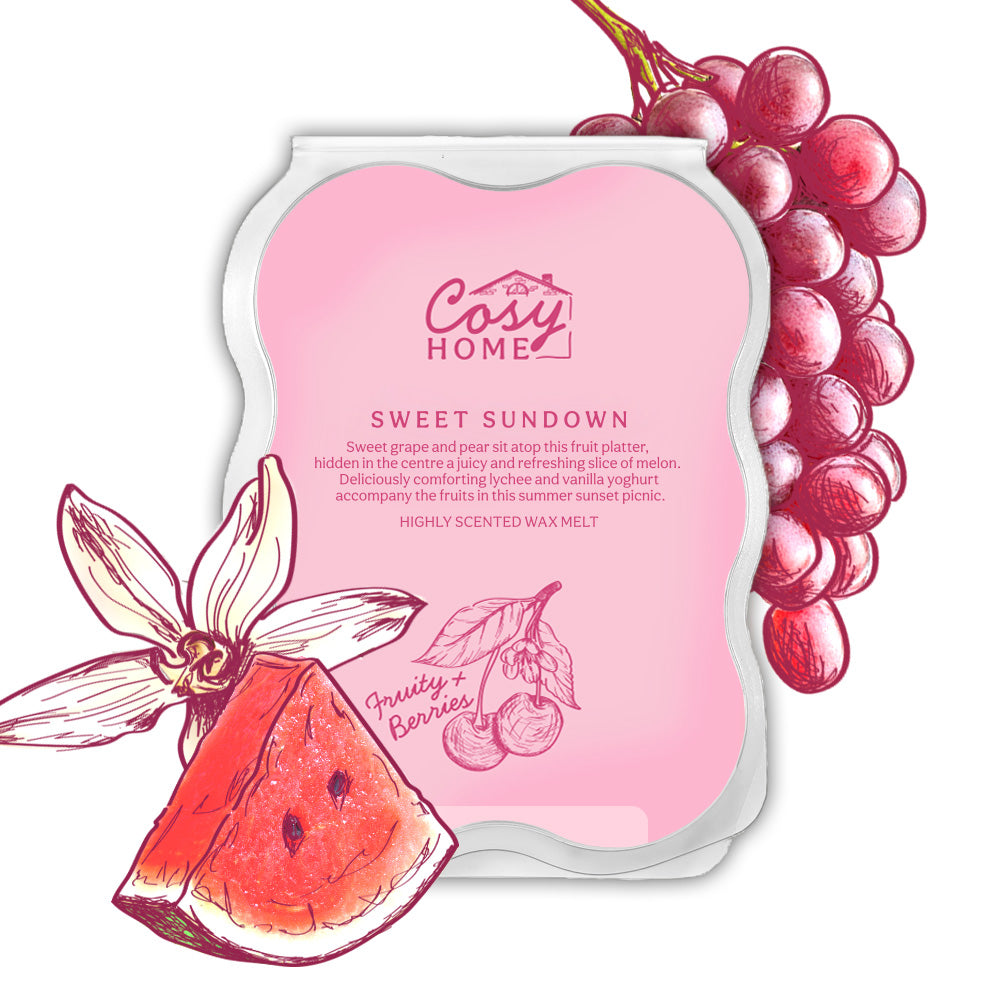 Sweet grape and pear sit atop this fruit platter, hidden in the centre a juicy and refreshing slice of melon. Deliciously comforting lychee and vanilla yoghurt accompany the fruits in this summer sunset picnic.